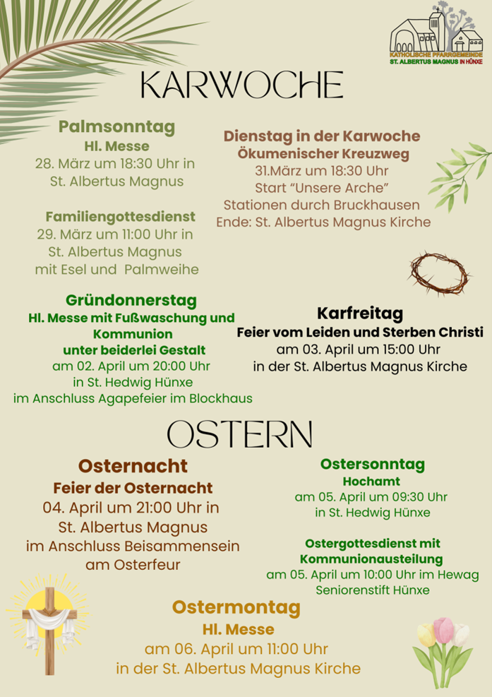 Die Zeiten der Heiligen Messen können bei den jeweiligen Kirchengemeinden in Erfahrung gebracht werden.